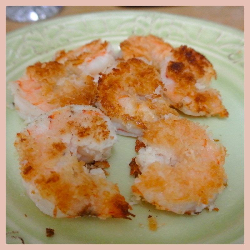 Dip shrimp in eggwhites covering both side , be careful not to soak it too much or the coconut will not stick well, take shrimp directly from eggwhite and dip into plate with coconut flour and shredded coconut flipping the shrimp to cover both side with a light coating.